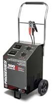 Best Schumacher PSW-70300A Manual or Automatic High Performance Charger Includes an array of clamps and cables, 600 Amp heavy duty, chrome plated steel ultra grip clamps, 6-foot long heavy duty commercial gauge welding grade cables and extra long 9 foot AC line cord The tubular chrome plated handle has a rubber grip and unique non-conductive clamp rest The precision timer controlled operation offers a 2.25 hour timer with Off and Hold positions for controlled or continuous recharging 300 Amp engine start, 70 Amp rapid charge, 40 and 20 Amp fast charge and 4 Amp